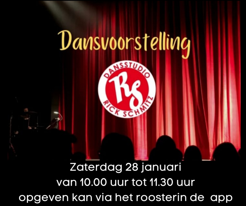 Zaterdag 16 december hebben wij weer onze dansvoorstelling.Iedereen is welkom om te komen kijken en deelnamen is gratis.Hier dansen wij alle dansen die we de afgeven tijd in de lessen hebben gedaan.Voor de bezoekers is er een kleine entree van €2,-Het optreden zal ongeveer 60 tot 90 min duren.Kleding keuze en tijdschema worden via de DsRS App kenbaar gemaakt.De DsRS dansvoorstelling is het moment om aan je ouders, vrienden en/of familie te laten zien wat je in onze danslessen leert.Aanmelden voor deelname kan in het rooster via de DsRS app.Doorgeven met hoeveel personen je komt kijken kan via de balie van de dansschool.Letop! Aanmelden is puur voor de aantal plaatsen, je kunt geen eigen stoel reserveren.